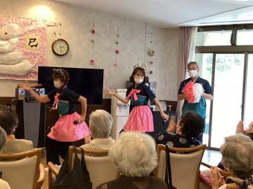 介護スタッフも一緒にフラダンスを踊る場面もあり、